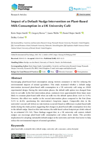 Encouraging plant-based food consumption among western consumers is vital for reducing the environmental impacts of animal agriculture. This study examined whether a default nudge intervention increased plant-based milk consumption in a UK university café using an ABAB experimental design. During the intervention phases, the default milk option was changed from dairy to oat milk. In the first intervention phase, customers were approximately three times more likely to consume plant-based milk when oat milk was the default option (from 16.6% to 51.9%). However, this effect was smaller in the second intervention phase compared to the first (from 51.9% to 46.0%), questioning the intervention’s long-term impact. Comparable data in the university’s second café (where no intervention occurred) found no differences in plant-based milk intake during the study period, suggesting that changes in plant-based milk consumption were due to the default nudge. Based on this intervention, the milk-based carbon footprint per drink reduced by an estimated 25-34%. These findings suggest that, in a UK university café context, default nudges can encourage plant-based milk consumption and reduce dairy intake. This provides implications for adopting sustainable default nudges in the university and wider food sector to help reduce the environmental impacts of animal agriculture.