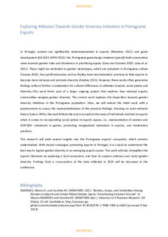 In Portugal, women are significantly underrepresented in esports (Monteiro 2021) and game development (Gil 2022; WPGI 2022). Yet, Portuguese game design students typically hold conservative views towards gender roles and disinterest in prioritising equity (Lima and Gouveia 2020; Lima et al. 2021). These might be attributed to gender stereotypes, which are prevalent in Portuguese culture (Tavares 2020). Non-profit advocates such as AnyKey have recommended practices to help esports to become more inclusive and promote diversity (AnyKey 2015). However, these works often generalise findings without further consideration for cultural differences in attitudes towards social justice and diversity. This work forms part of a larger ongoing project that explores how national esports communities navigate gender diversity. The current work explores the disposition towards gender diversity initiatives in the Portuguese population. Here, we will extend the initial work with a questionnaire to assess the representativeness of the previous findings. Drawing on actor-network theory (Latour 2005), the work follows the actors to explore the views of individuals involved in esports when it comes to incorporating social justice in esports spaces, i.e., representation of women and LGBTQIA+ individuals in games, promoting marginalised individuals in esports, and moderation practices. This research will yield several insights into the Portuguese esports’ ecosystem, which remains understudied. With recent campaigns promoting esports in Portugal, it is crucial to understand the best way to ingrain gender diversity in an emerging esports scene. This work will also strengthen the esports literature by exploring a local ecosystem, and how its aspects embrace and resist gender diversity. Findings from a cross-section of the data collected in 2024 will be discussed at the conference.