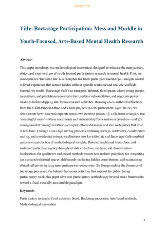 Manuscript_Backstage Participation Mess and Muddle in Youth-Focused Arts-Based Mental Health Research_Revised_FINAL (002).pdf - Accepted Version Available under License Creative Commons Attribution Non-commercial. Download (1MB) | Preview |