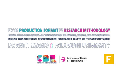 Saario, Antti ORCID logoORCID: https://orcid.org/0000-0002-2912-1354 (2025) From Production Format to Research Methodology: Spatial Audio Composition as a ‘New Beginning’ in Listening, Sensing, and Understanding. In: Innovation In Music 2025 - New Beginnings: From Tabula Rasa to Rip It Up And Start Again, 20-22 June 2025, Bath Spa University, Bath, UK.