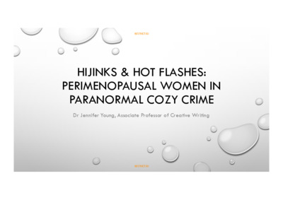 Young, Jennifer ORCID logoORCID: https://orcid.org/0000-0002-4128-2097 (2023) Hijinks and Hot Flashes: Perimenopausal Women in Paranormal Cozy Crime. In: Captivating Criminality Conference, 31 August-2 September 2023, Bath, UK.