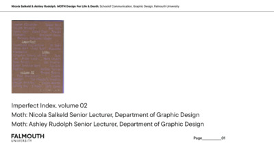 Salkeld, Nicola ORCID logoORCID: https://orcid.org/0000-0003-2626-965X and Rudolph, Ashley ORCID logoORCID: https://orcid.org/0000-0001-9666-9099 (2025) Imperfect Index Vol 2 Moth Design For Life & Death. Imperfect Index, 2 (N/A). pp. 122-125. ISSN N/A